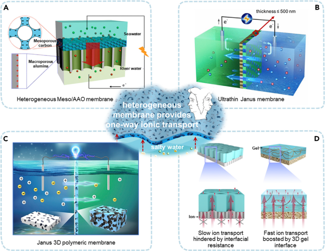 图2. 基于离子-整流效应的异质结构薄膜盐差能发电器件。(A)用于捕获渗透能的Meso和AAO异质膜;(B)特制的亚微米级(约500 nm)杂化膜,提高了膜的渗透性;(C)具有非对称且高电荷密度的Janus膜,即使在高盐溶液中也能提供单向离子传输;(D)三维(3D)凝胶界面,提高了界面传输效率,改善了能量捕获性能。