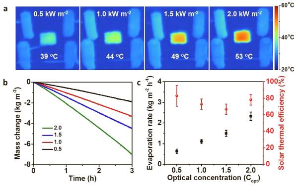 (c)不同光照强度下的水蒸发速率和太阳能光热转换效率