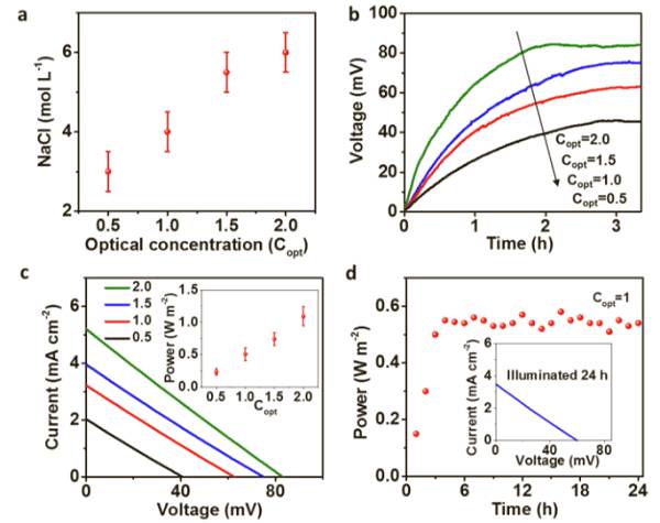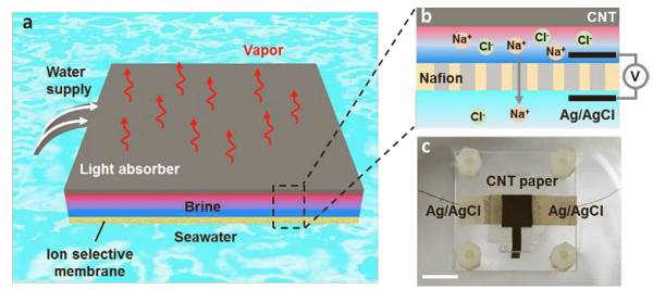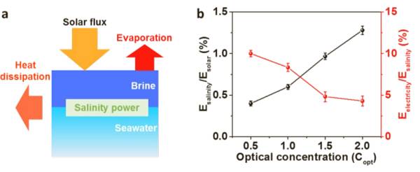 在这项工作中,研究人员提出了一种利用太阳能同时进行海水淡化和盐差发电的新概念,证明了利用太阳能产生蒸汽实现海水淡化的同时,可摆脱江河入海口的限制在海面上直接产生盐差能,为在海面上直接进行海水淡化以及获取电能提供一种新思路。