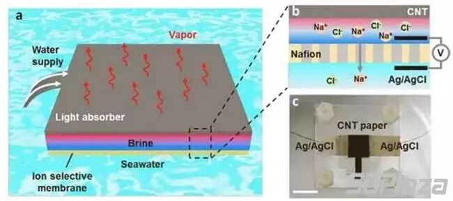 在这项工作中,研究人员提出了一种利用太阳能同时进行海水淡化和盐差发电的新概念,证明了利用太阳能产生蒸汽实现海水淡化的同时,可摆脱江河入海口的限制在海面上直接产生盐差能,为在海面上直接进行海水淡化以及获取电能提供一种新思路。