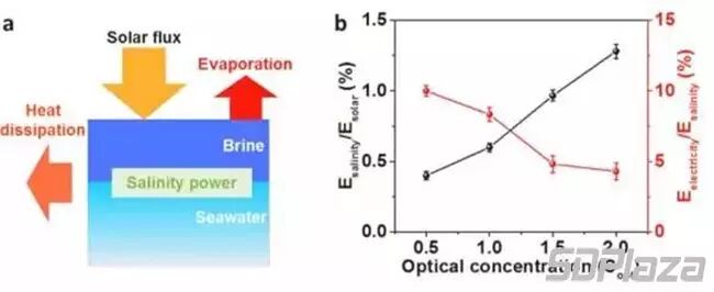(b)太阳能能到盐差能的转换效率(E盐度/E太阳能)和盐差能到电能的转换效率(E电/E盐度)