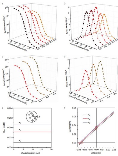 作者结合电化学系统中跨膜离子电流、罗丹明6G(Rh(+))和磺基罗丹明(Rh(-))渗透率测试及膜中钾离子的荧光光谱测试,发现并确认了SPEEK膜具有优异的阳离子选择性。在 盐度梯度功率转换为电能的实验中,作者发现当两种不同浓度的溶液在SPEEK膜的两边相遇时,产生的化学势梯度驱动离子跨过膜,从而产生朝向平衡态的离子扩散通量。阳离子根据其电荷极性自发地扩散穿过离子选择膜,而抗衡离子几乎被排斥,从而导致离子的净电荷迁移。 受益于溶液中电极上的反应,吉布斯的混合自由能可以部分提取,收集的电能可以通过负载电阻(RL,图3d中的插图)传输到外部电路。 基于SPEEK膜的发生器随着盐度梯度(0.5M-5M)的增加,输出功率从0.4 W / m 2 (5倍)增加到20.2 W / m 2 (500倍),此外,膜在pH值为3到11的电解液中仍具有出色的渗透压转换性能。在模拟海水和河水交汇处的盐度梯度(0.01M/0.5M)的测试中,SPEEK膜最大的输出功率达到了5.8 W / m 2 ,达到了商用要求。