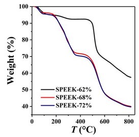 将PEEK和硫酸分别添加到三颈烧瓶中,并在50℃的温度下搅拌,形成棕色溶液。随后,将棕色溶液倒入冰水中,并生产出轻质聚合物。然后,将聚合物用纯净水洗涤数次,直到混合物的pH值达到7并在60℃下干燥,得到产物SPEEK。将SPEEK溶解在NMP中,形成均匀的粘着溶液,然后静置24 h以去除气泡。随后,使用预清洗的刮板作为流延机将溶液流延到洁净的玻璃基板上。通过改变基材和刮板之间的间隙,控制SPEEK的膜厚。然后,将底物转移到甲苯浴中4天。之后,将膜从玻璃基板上剥离,分别浸入正己烷和水浴中。最后,膜在室温下自然干燥,得到SPEEK膜。