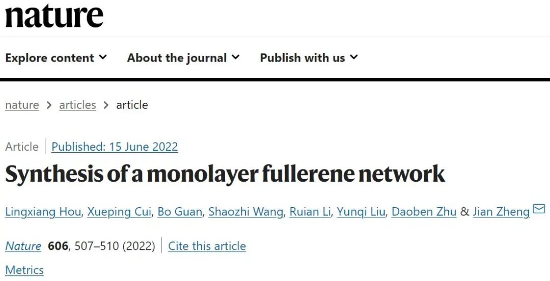 6月16日,中国科学院化学研究所研究员郑健团队在国际学术期刊《自然》(Nature)上发表了题为Synthesis of a monolayer fullerene network 的新成果。该工作在常压下通过简单的反应条件,创制了一种新型碳同素异形体单晶——单层聚合C60。这是一种全新的簇聚二维超结构,由 C60簇笼在平面上通过C-C键相互共价键合形成规则的拓扑结构。这种新型碳材料具有较高的结晶度和良好的热力学稳定性,并具有适度的禁带宽度,为碳材料的研究提供了全新思路。