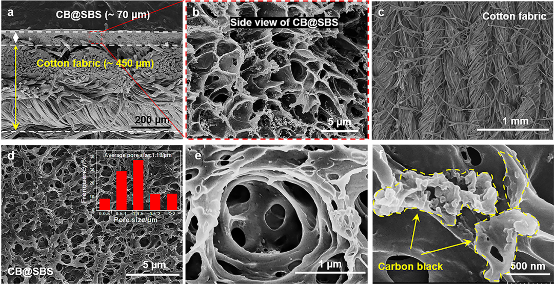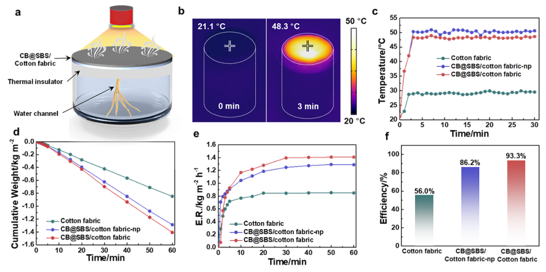 利用BFT法在棉织物上形成的CB@SBS层侧面和表面都具有分布均匀且相互贯通的孔洞(图2),其成孔机理为:表面涂覆有CB@SBS混合溶液的棉织物放入高湿环境中后,混合溶液中CHCl3强烈的挥发性造成了CB@SBS层表面温度的下降,引起了表面水滴的凝结,水滴的凝结会释放热量来补偿挥发所吸收的热量,从而达到平衡;如果这个过程持续很长一段时间,CB@SBS表面就会凝结足够多的水滴,覆盖整个表面;当CB@SBS/棉织物从高湿环境中取出后,表面的水滴会自主挥发,形成大小不一的孔洞(图1)。CB@SBS的多孔结构有利于光的吸收和水蒸气的逸散(图3d-g),从而使得CB@SBS/棉织物在一个太阳光下实现了1.40 kg m-2 h-1的水蒸发率和93.3%的光蒸汽转化效率(图4)。