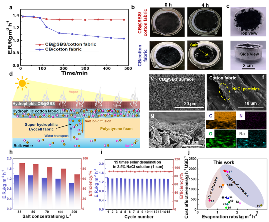 除了多孔结构的作用,CB@SBS/棉织物还具有上层疏水下层亲水的Janus结构(图3a-c),能够在盐水处理过程中实现稳定高效的水蒸发,有效解决表面盐结晶的问题。在一个太阳光下,CB@SBS/棉织物在3.5% NaCl中能实现1.37 kg m-2 h-1的高效稳定水蒸发和91.3%的光蒸汽转化效率,且在15个循环周期内表面无盐积累。另外,该CB@SBS/棉织物不仅机械性能优异,耐用性好(图3h-i),而且相比于目前大多数的光蒸汽转化材料,具有性价比高的优势(图5)。