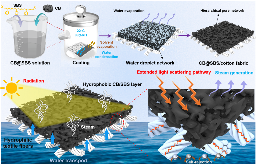图1. CB@SBS/棉织物的制备流程和太阳能水汽蒸发机理示意图