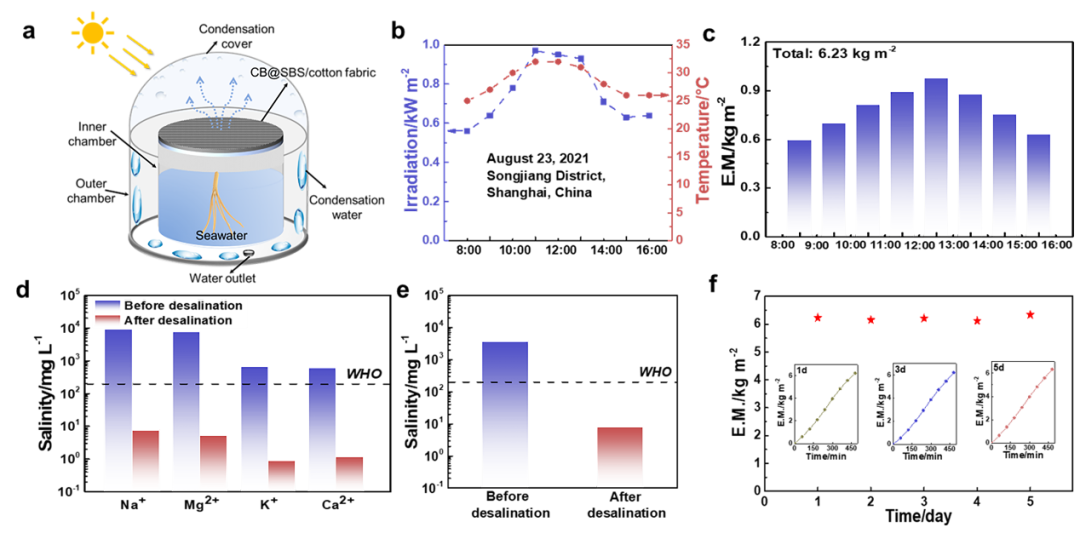 在户外实验中,以CB@SBS/棉织物为基础,搭建了一个简易的太阳能驱动淡水收集装置,该装置在一天(8:00-16:00)的自然光照下,实现了6.23 kg m-2的水收集,且在连续五天内依然保持着稳定高效的收集水平,收集的水能够达到人的饮用标准(图6)。优异的光蒸汽转化性能、良好的机械性能、较高的性价比和简单的制备工艺使CB@SBS/棉织物具有很好的实际应用前景。