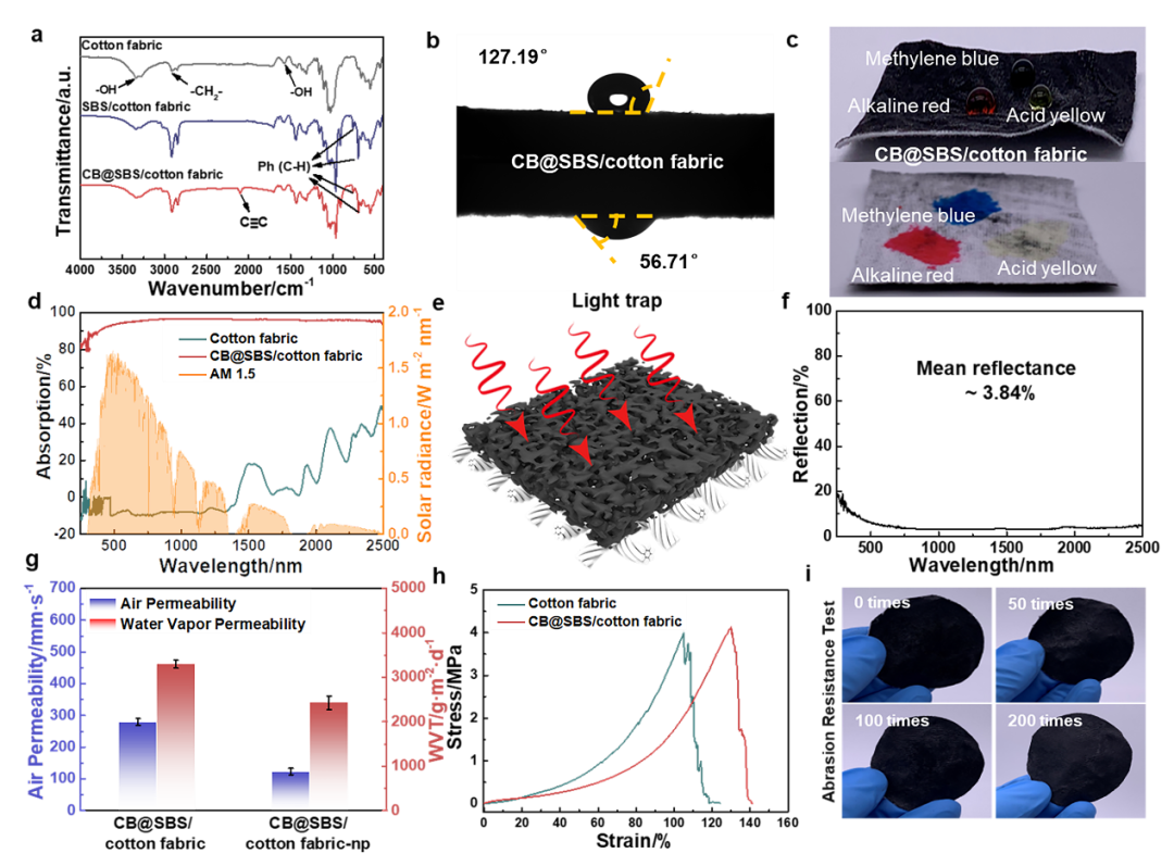图3. CB@SBS/棉织物的水润湿性能、光吸收率、透气透湿性和机械性能