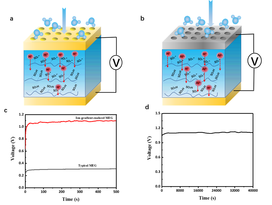 图2 设计的离子梯度增强型湿气发电机与常规湿气发电机性能对比
