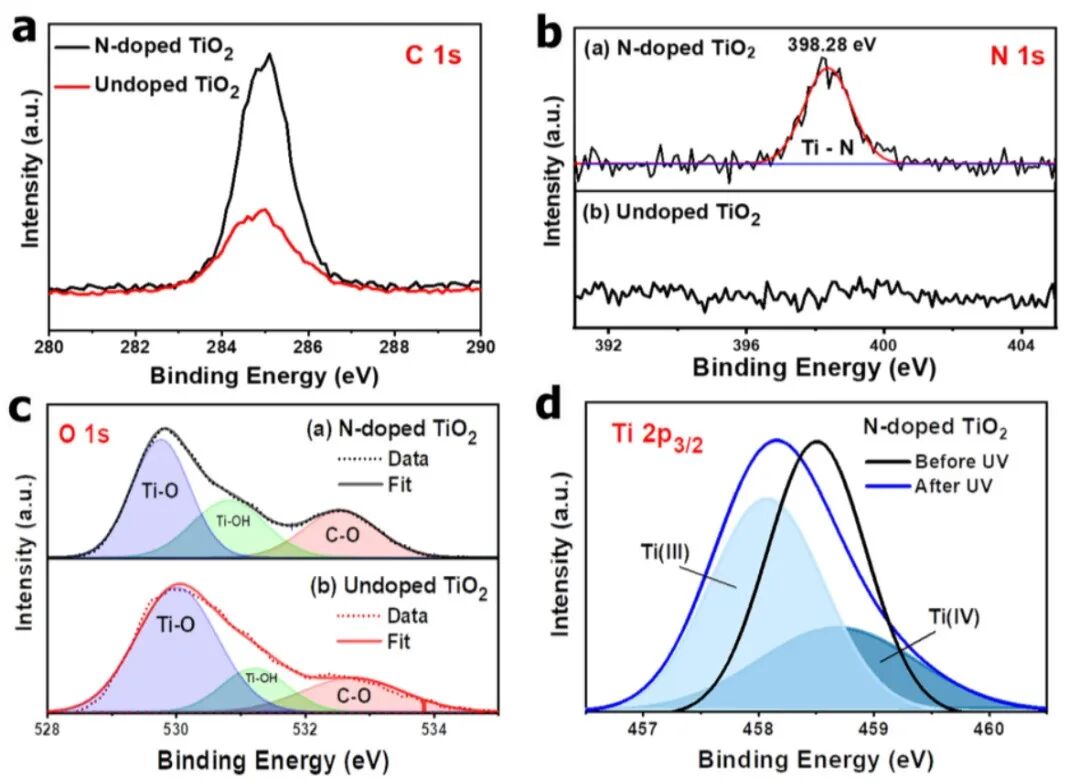 其实,在以往的研究中,课题组就已发现在 TiO2 纳米晶体合成过程引入的乙二醇可以吸附在 TiO2 表面,起到空穴牺牲剂的作用。而在这次的研究中,该团队希望利用这个原理,并且放大牺牲剂的效果,而达到这个目标的关键是引入氮掺杂技术。