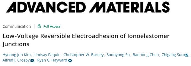 然而,Hayward对离子弹性体的电粘合性能很感兴趣。最新工作表明,只需1 V,相反的离子弹性体就可以可逆地快速粘在一起。其他导电胶的工作电压通常在1000V左右,这个巨大的差异也意味着安全问题。但这一发现给研制安全、高效、坚固的执行器系统带来了希望,使软机器人能够处理精细的样品。