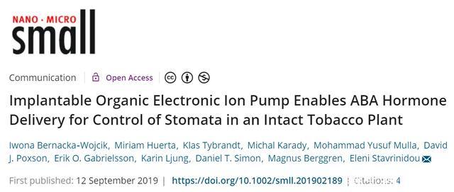 类似的离子泵装置也被用于与植物进行通讯和控制。去年,瑞典林克平大学的Eleni Stavrinidou和同事首次成功地将基于微小的玻璃毛细管纤维的有机电子离子泵植入烟草植物的软组织中。