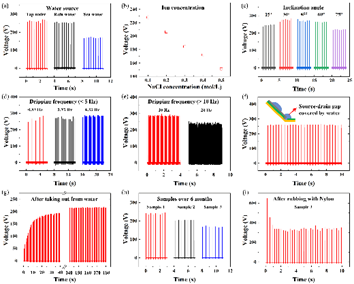 面对化石能源日益枯竭与人类能源消耗日益增长的矛盾,可再生能源的开发和利用是解决能源危机的重要手段。水覆盖了地表约 72% 的面积,蕴藏着巨大的能量,其中就包括以雨滴、河流、波浪等多种形式存在的动能。基于电磁效应的传统水力发电在水资源丰富的地区已经广泛应用,但其往往要求非常大的水量来提供足够的动能。相比之下,蕴藏在液滴形式中的丰富能量尚未得到有效开发和利用。据估算,每年全球范围内雨滴动能的总和为3000 TW·h,相当于每年全球能源消耗的 5%。近日,香港城市大学杨征保教授团队开发了一种大面积雨滴发电面板,可利用固定位置液滴撞击和随机位置液滴撞击来进行高效发电。该雨滴发电面板具备高性能、易于集成、全透明、低成本、稳定性佳等优点,在雨滴-太阳能面板、智能窗户、自驱动环境监测等领域具有巨大潜力。相关研究成果以“Droplet energy harvesting panel” 为题在能源与环境领域权威期刊Energy & Environmental Science(IF:38.532)上发表(DOI: 10.1039/d2ee00357k)。港城大在读博士生许晓特为论文第一作者,杨征保教授为论文通讯作者,论文合作者为王钻开教授,论文的其他作者有李鹏宇、丁永韬、徐王淮、刘世源和张卓敏。雨滴发电面板(下文简称面板)由类晶体管结构的雨滴发电器件单元和一个全波整流器组成。雨滴发电器件单元的开路电压和短路电流分别为266.6 V和273.6 μA,高于双电极或者单电极的液固摩擦纳米发电机。得益于类晶体管的结构,液滴铺展过程中(液体-固体摩擦)积累的丰富电荷在器件“开启”(液滴接触漏极)时得以快速释放,产生高输出电压和电流。高性能的器件单元是制备大面积高性能面板的基础和前提。图1 雨滴发电面板的工作机理及性能。(a) 雨滴发电面板和器件单元示意图; (b) 工作机理示意图; (c) 器件单元的输出电压和电流; (d) 不同器件结构的输出电压比较。在大面积面板中,源极和漏极之间无法避免的寄生电容会对输出性能产生较大的影响。在A4纸大小的面板中,共面电极面板的输出显著优于非共面电极面板(如图2c所示)。在非共面电极器件单元中,上电极和底电极之间会产生一个较大的寄生电容,这个寄生电容会阻碍电荷释放到外部电路。进一步的研究也表明,随着上电极面积的增大,器件的寄生电容随之线性增大,导致其输出电压随之减小(如图2d所示)。A4纸大小的共面电极面板和非共面电极面板的寄生电容分别为80.20 pF和871.90 pF。由此可见,共面电极结构有效地减小了寄生电容,可使大面积面板维持较高的性能(输出电压103.47 V)。图2非共面电极结构中寄生电容的负面分流效应。(a)共面电极面板示意图;(b)非共面电极面板示意图;(c)A4纸大小共面电极面板与非共面电极面板的输出性能比较;(d)非共面电极单元的输出电压、寄生电容与上电极面积的关系;(e)非共面电极器件寄生电容示意图;(f)非共面电极器件的等效电路模型。大面积雨滴发电通常有两种应用场景:1.将雨水收集后由液滴产生器产生的固定位置液滴;2.自然环境中降雨的随机位置液滴。针对这两种场景,该团队设计不同的面板拓扑来进行高效发电。对于固定位置液滴,该团队设计了带孔的类棋盘状面板,有效避免了上方位置液滴形成的水流干扰。该团队进一步对单整流器面板和传统多整流器阵列进行比较,两者均能有效地对电容器进行充电,表明了该面板同时具备高性能和结构简单的优点。图3用于固定位置液滴发电的带孔类棋盘状面板。(a)固定位置液滴产生器;(b)带孔的类棋盘状面板示意图;(c)多整流器液滴发电器阵列示意图;(d) 单整流器面板和多整流器阵列的充电性能比较。在随机位置液滴的应用中,该团队设计了条状单元面板来提高雨滴发电效率。由于类晶体管结构雨滴发电器件的输出与液滴接触漏极时的铺展面积有密切关系(如图4a所示),因此提高液滴完整输出(液滴铺展到最大面积时接触到漏极)的概率有助于提升雨滴发电效率。该团队比较了类棋盘状面板和条状单元面板中液滴初始撞击位置产生完整输出的概率,发现条状单元面板对随机位置液滴的发电效率更高,其完整输出的概率是类棋盘状面板的2倍以上。实验表明,共面电极条状单元面板在随机位置液滴撞击下可有效地对电容器进行充电。图4 用于随机位置液滴发电的条状单元面板。(a) 输出电压与液滴接触漏极时铺展面积的关系;(b) 类棋盘状面板示意图;(c)类棋盘状面板产生完整输出的液滴初始撞击位置(位置5和14);(d)条状单元器件底接触、左接触和右接触的输出电压;(e)条状单元面板示意图;(f)条状单元面板产生完整输出的液滴初始撞击位置(位置5、8、11和14);(g)共面电极条状单元面板示意图;(h)随机位置液滴撞击下的充电曲线。该团队对雨滴发电器件的鲁棒性和稳定性进行了较为全面表征,研究了不同水源、液滴离子浓度、器件倾斜角度、滴水频率的影响。此外,该团队还表征了在两种极端条件下的输出:(1)源漏间隙被水覆盖的情况,器件性能几乎不受影响;(2)在水中取出后,性能在连续液滴撞击下逐渐恢复并在3分钟内达到稳定。在长期稳定性方面,器件在放置6个月后仍然保持较高水平的输出。图5鲁棒性和稳定性。(a) 水源;(b) 离子浓度;(c) 倾斜角度;(d) 滴水频率(<5 Hz);(e) 滴水频率(>10 Hz);(f) 源漏间隙被水覆盖;(g) 在水中取出后;(h) 6个月以上的样品;(i) 性能恢复。该团