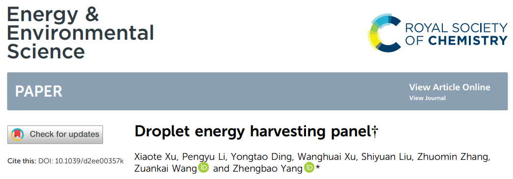 香港城市大学杨征保团队《EES》: 大面积雨滴发电面板
