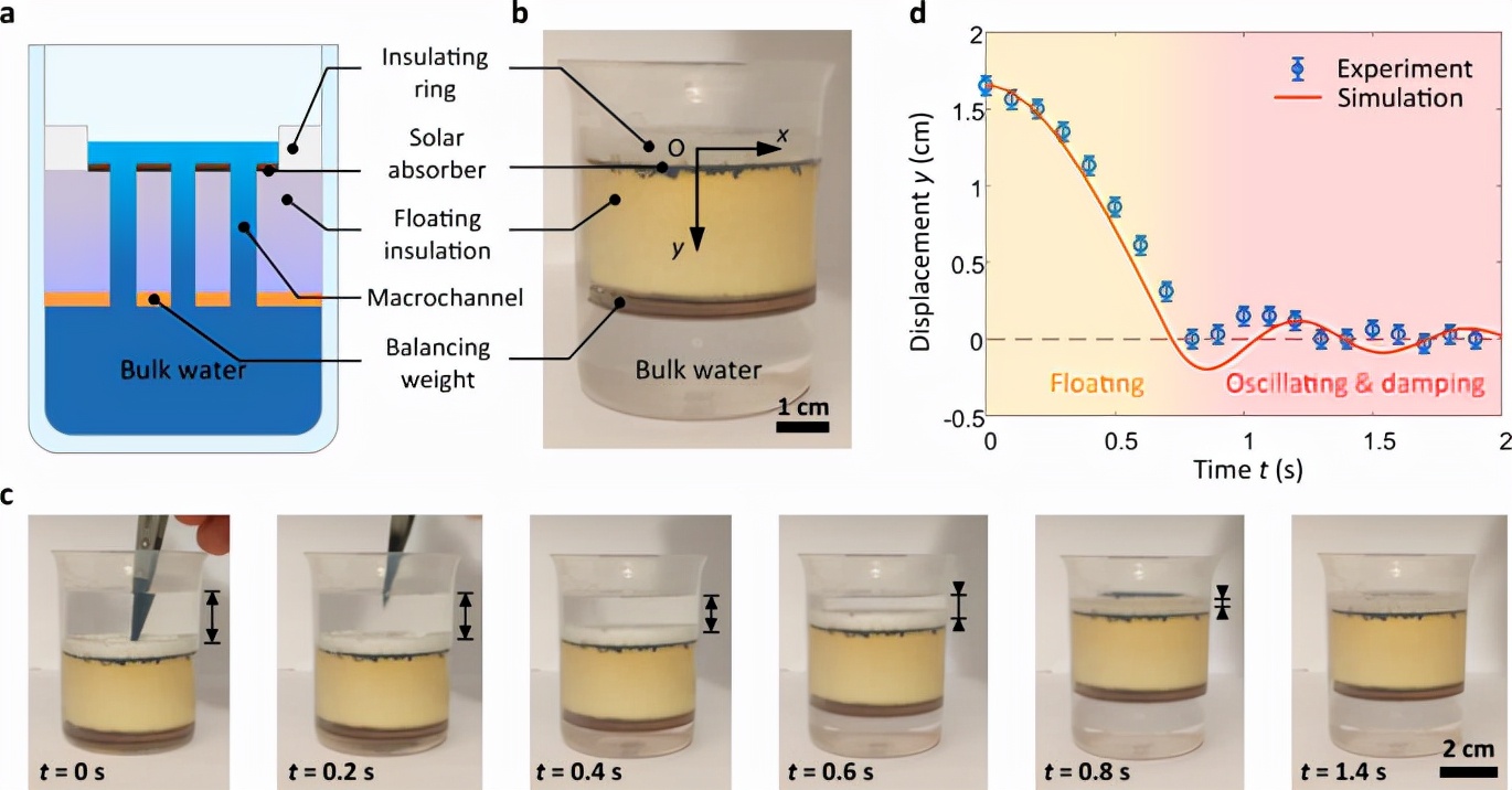 于是,该团队尝试换一种思路来解决此类痛点,他们开始专注开发一种非毛细海水淡化系统。将绝热材料涂黑用于吸收太阳光热量。同时绝热层上方形成一个薄水层,利用通孔连通上下的盐水,整个系统可以浮在蓄水池或池塘。