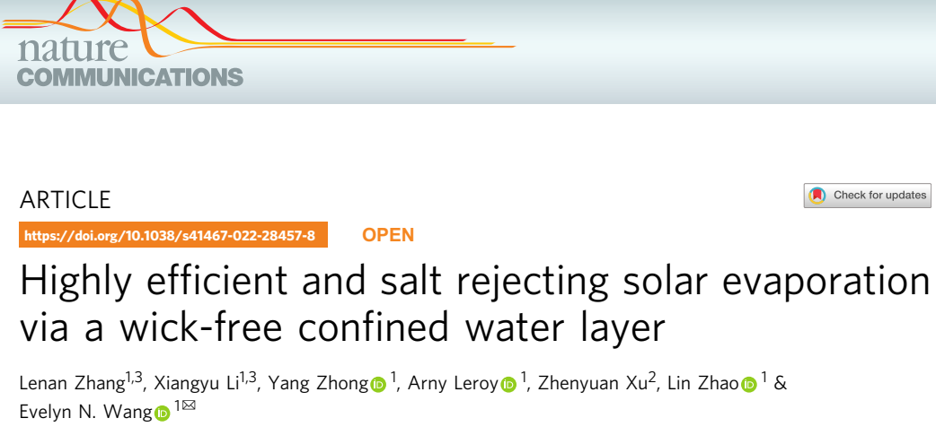 2 月 14 日,相关论文以《通过非毛细结构实现高效且无盐的太阳能蒸发》(Highly efficient and salt rejecting solar evaporation via a wick-free confined water layer)为题发表在 Nature Communications上,该研究成果由 MIT 博士研究生张乐楠、博士后李翔宇、机械工程系教授伊夫林・王(Evelyn Wang)等人共同合作完成[1]。