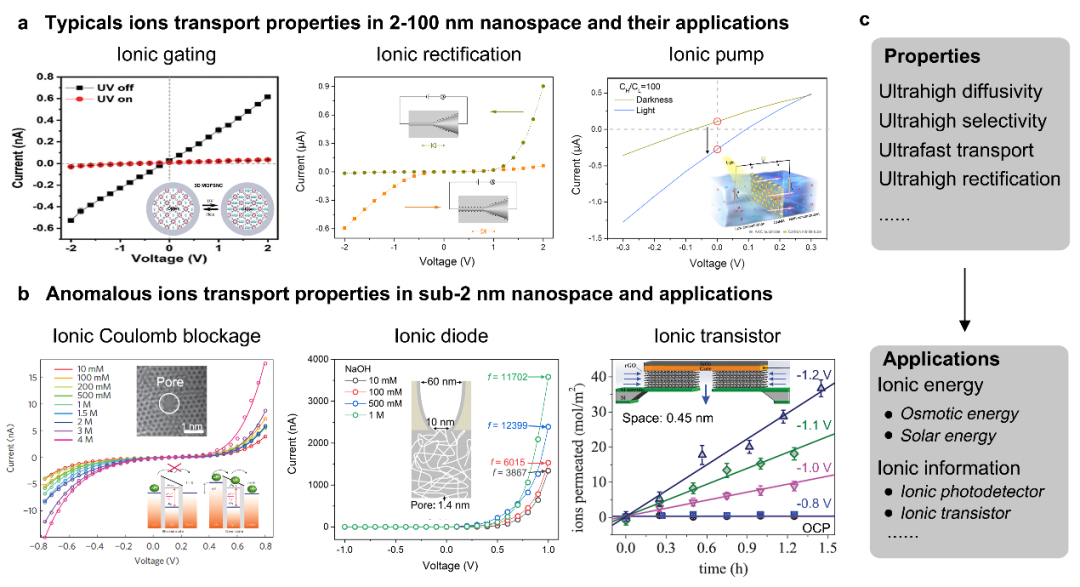 图6. 2 - 100 nm及以下离子输运特性的典型例子。a)在2-100 nm范围内,离子可在特定的方向上运输,表现出离子门控、离子精馏和离子泵的特性。b)在2 nm以下尺度下,证实了一些类量子力学特征,如离子库仑堵塞、离子二极管、离子晶体管。c) 液体纳米离子学的基本性质及其在能源和信息处理器中的应用。