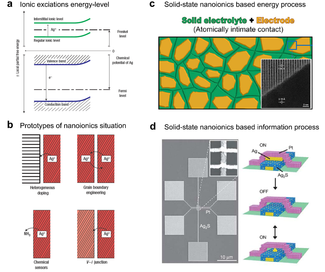 图4. 固体纳米离子学的概念及其在能量和信息过程中的应用。a)离子激发可以用(部分自由)能级图表示,这通常用于电子激发。b)涉及到固体离子导体边界的四种原型情况(以Ag+导体为例):接触到吸附Ag+的绝缘相;晶界;与酸碱相接触的活性气相;接触到另一个Ag+导体。c)原子亲密化固-固界面,改善固体电解质电池中的离子转运。d)离子忆阻器在固态材料中的离子传输。