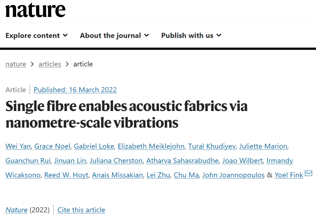 今年早些时候,美国麻省理工学院的Yoel Fink教授团队(fibers@MIT)在Nature主刊报道了他们新开发的一款声学织物,其可像人的耳朵一样听见并记录微弱的声音。Yoel Fink教授为论文通讯作者,严威博士(现新加坡南洋理工大学电子与电气工程学院及材料科学与工程学院双聘助理教授)为论文第一作者。