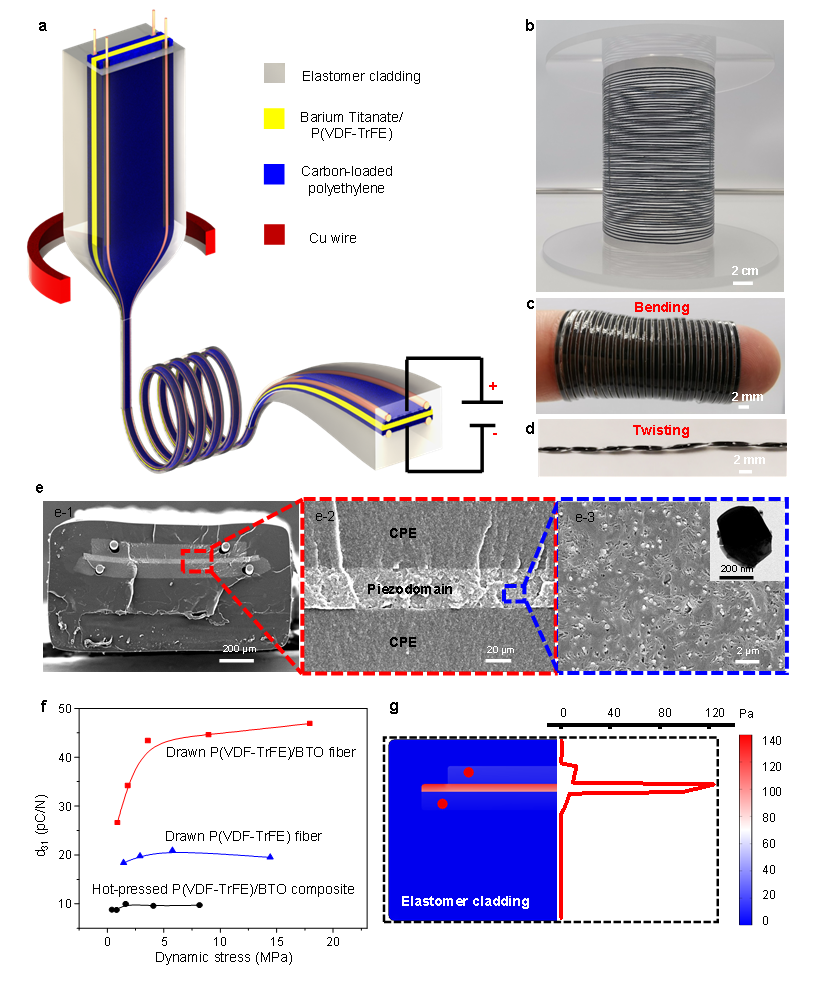 采用基于光纤生产的热拉技术,一步大批量地制备由六种材料组成的纤维,这六种材料包括P(VDF-TrFE)与压电钛酸钡(BaTiO3)陶瓷颗粒复合形成的纤芯,纳米碳粉与聚乙烯复合形成的电极,Cu丝电极以及SEBS弹性体。热拉技术可以将具有不同的电、光、声、热和机械性能的材料甚至微纳芯片一步集成到单根纤维中,所制备的纤维具有极其精致的宏观微观结构和复杂多样的功能。