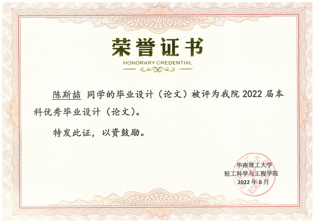 祝贺本课题组培养的本科毕业生陈斯喆以优异的毕业论文成绩获得学院2022届本科优秀毕业设计(论文),并以优异的成绩被保送至南京大学攻读硕士研究生!
