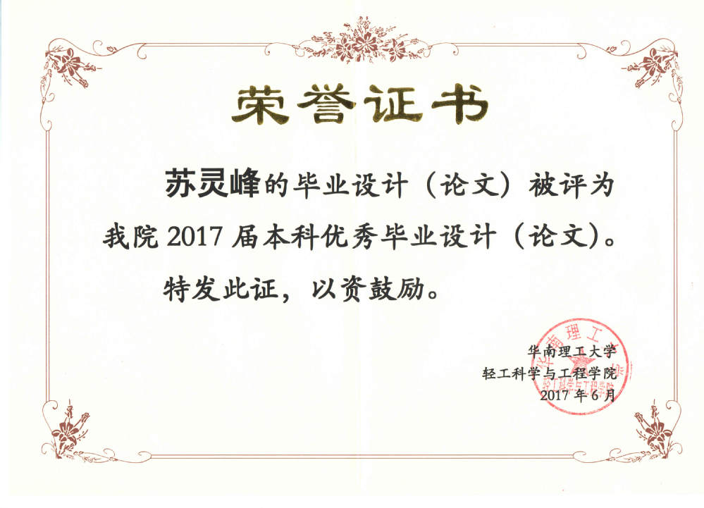 祝贺本课题组培养的苏灵峰同学以优异的学术论文成绩获得学院2017年届本科优秀毕业设计(论文)荣誉称号!并以优异的成绩留本课题组免推攻读硕士研究生!