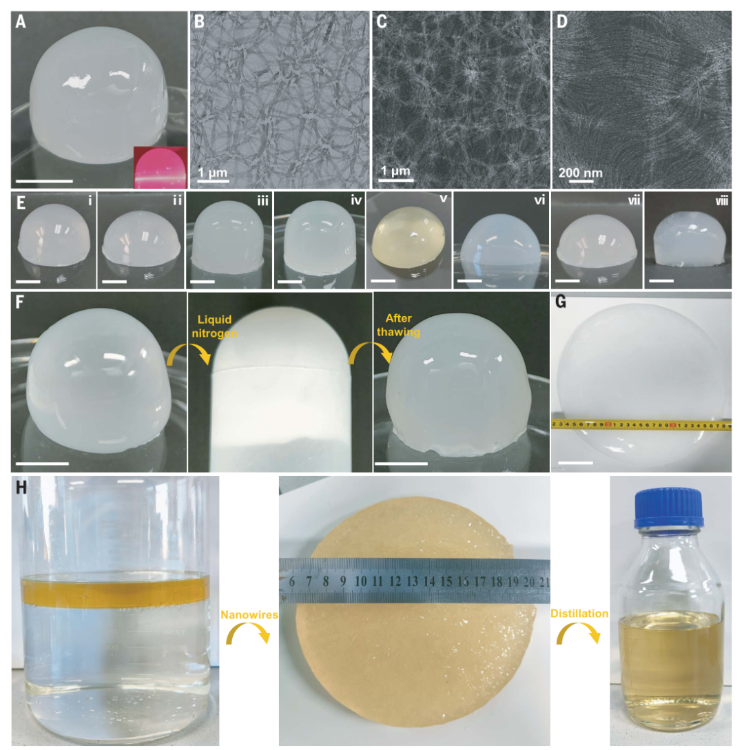 通过一系列实验,王训团队发现仅仅需要少量的纳米线状粒子与一些易挥发的有机液体混合既可以形成凝胶。这些有机液体包括环己烷、己烷、甲苯、汽油,正丙醚等。凝胶具有明显的丁达尔效应,并且该类有机凝胶在水中也有良好的稳定性,可以用于在水中汽油的回收。在经过离心或蒸馏后,可以得到纯度为99.5%以上的汽油,证明该类有机凝胶易于与有机液体分离的特性。回收的纳米线状粒子可以再次与其他有机液体再次凝胶化,重复使用次数可达10次。为了验证凝胶的稳定性,王训团队将凝胶放置于液氮中凝固,并再融化,发现凝胶保持原有状态。