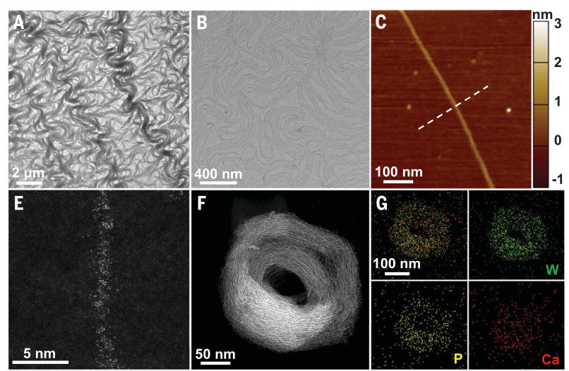 science.abm7574.pdf这种纳米线状材料的制备十分简单,将硝酸钙,磷酸钨水合物以及油胺以一定比例,在水中混合即可形成所需的纳米线状材料。钙离子在磷酸钨离子之间起到了桥接作用,通过电性相互作用形成纳米线状粒子,质子化的油酸则附着于纳米线粒状子表面,维持着纳米线状粒子的电中性和在水中的稳定性。王训团队同时还试验了其他金属离子,发现除了锶离子以外,无法形成类似结构的纳米线状粒子。