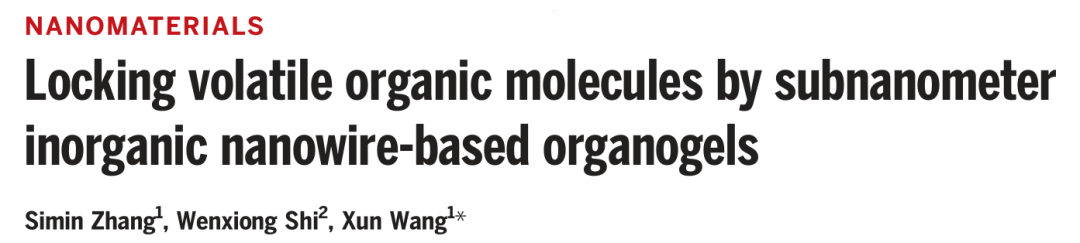 但是,对于绝大多数有机凝胶,如聚合物交联网络形成的有机凝胶,一方面是受限于其溶胀率,该类材料的存储量有限;另外一方面是有机溶液的释放只能通过加热蒸馏,释放困难。为了方便易挥发有机液体的存储,而清华大学王训团队开发出了一种利用碱土金属离子钙离子、多金属氧酸盐及油胺形成了一种纳米线状材料,这种纳米线状材料可以和十多种易挥发的有机液体形成有机凝胶,利用少量的该材料(0.53%)即可以使得大量的有机液体凝胶化,仅需要离心既可以将该纳米材料与有机液体分离并可以重复利用十次以上。该工作以题为“Locking volatile organic molecules by subnanometer inorganic nanowire-based organogels”的文章发表在Science上。