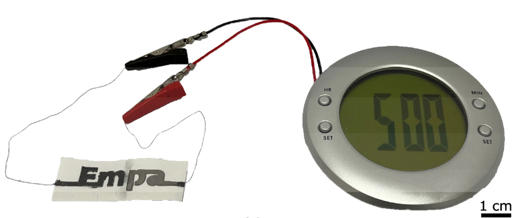 在研究人员随后的实验中,用两滴水在20秒内就可将电池激活,激活后,在不连接耗能设备时,单芯纸电池的电压为1.2V(我们日常使用的碱性电池的电压为1.5V),可稳定供电1小时左右。为了证明一次性印刷纸电池能够运行低功率电子设备,研究人员将两节纸电池组合成为一个电池成功为带有LCD显示屏的小型闹钟供电。