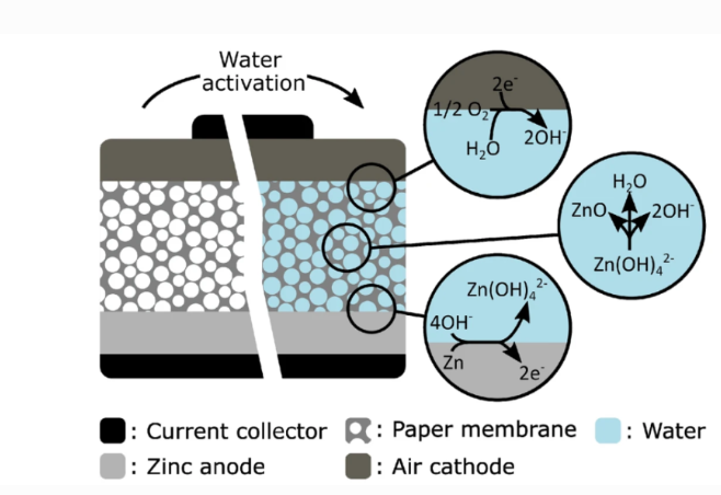 当纸变湿时,纸中的盐会溶解并释放带电离子,从而使电解质具有离子导电性。这些离子通过在纸张上分散来激活电池,使得阳极墨水中的锌被氧化,从而释放出电子。这些电子通过含石墨和黑炭的墨水、电线和设备从含锌阳极转移到石墨阴极。因此,这些氧化还原反应会产生用于为外部电气设备供电的电流。由于该设备是由水激活的,因此只要保持干燥,它的保质期就会非常长。