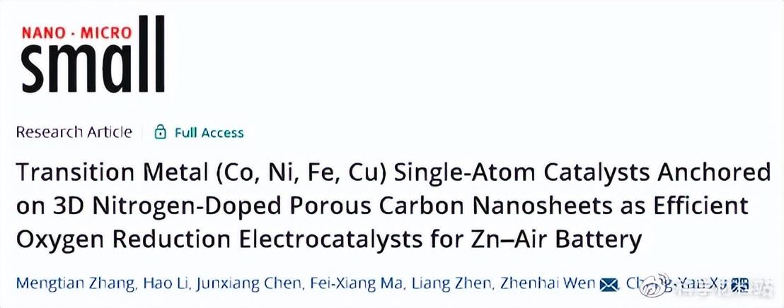 近日,来自哈尔滨工业大学(深圳)的徐成彦教授与中国科学院福建物质结构研究所的温珍海教授合作,在国际期刊Small上发表了题为“Transition Metal (Co, Ni, Fe, Cu) Single-Atom Catalysts Anchored on 3D Nitrogen-Doped Porous Carbon Nanosheets as Efficient Oxygen Reduction Electrocatalysts for Zn–Air Battery”的文章。