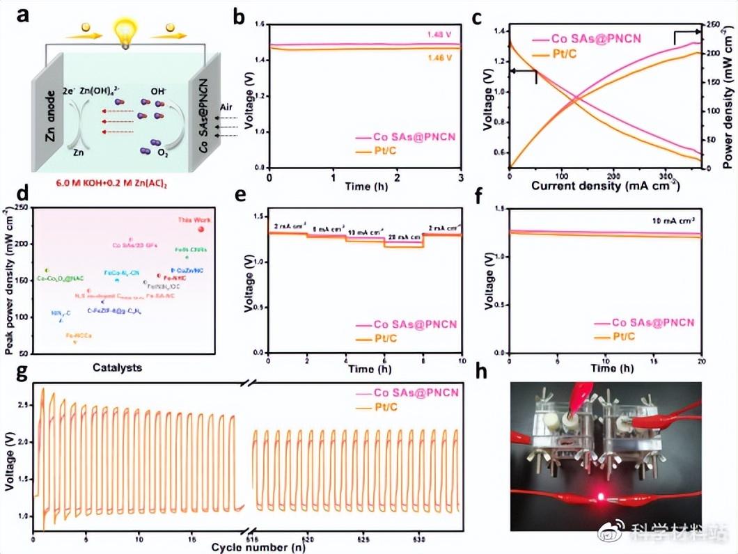 以Co SAs@PNCN作为空气阴极催化剂组装的锌空气电池显示出高的开路电位 (1.48 V),较大的功率密度 (220 mW cm-2),以及超过 530圈循环的稳定性。