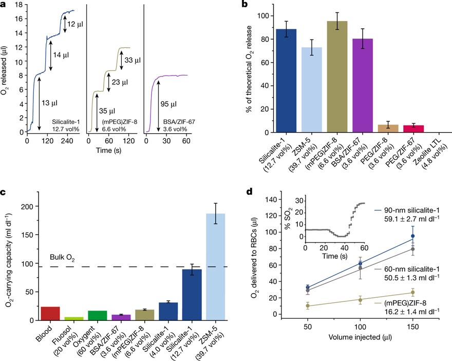 体积分数为4.0%的Silicalite-1沸石胶体的载氧量与血液接近,体积分数为12.7%的Silicalite-1沸石胶体,载氧能力增加到与纯氧气体相近的水平。此外,由于“多孔水”相对较低的粘度,O2的溶解过程在几秒之内即可达到平衡。