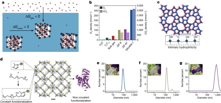 事实上,许多沸石(如Silicalite-1)和MOF(如ZIF-8、ZIF-67)都是制备“多孔水”的理想材料,根据吉布斯自由能判据,气体分子可以自发的从水中进入多孔纳米材料内部。亲水性的外表面可以保证其在水中的分散性,而疏水性的内表面又可以确保微孔内的干燥环境。