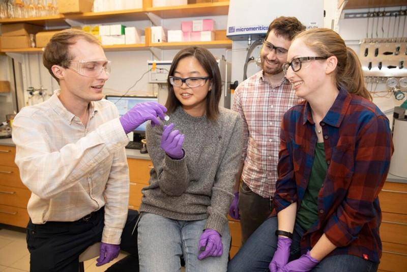 Jarad Mason(右二)和他的团队制备的“多孔水”。图片来源:哈佛大学[5]