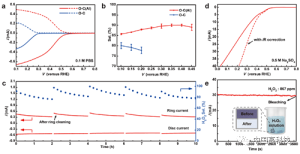 此外,O-C(Al)在中性2e -ORR中具有优异的催化活性和稳定性,这对H 2O 2的实际应用具有重要意义。在30 mA·cm -2的电流密度下,1小时内H 2O 2的产量达到~867ppm(选择性为92%),可用于纸张的漂白(图4)。该研究为电化学制备H 2O 2提供了高效、低成本的电催化剂,具有潜在应用价值。