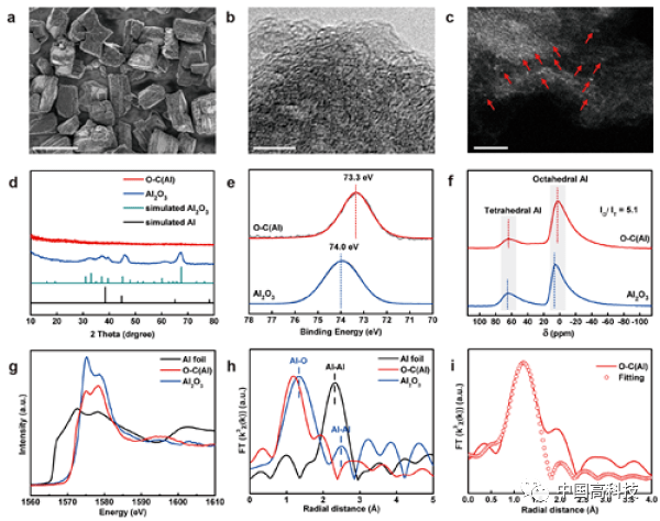 图2.(a-c)O-C(Al)的SEM、HRTEM和ac-STEM;(d)XRD;(e)XPS;(f)固体核磁;(g-h)同步辐射数据