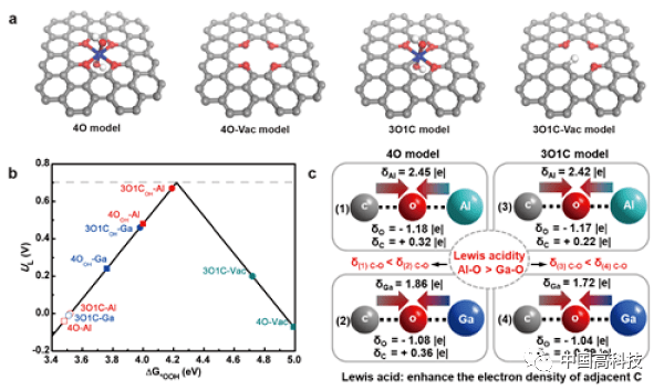 图1.(a)理论计算模型;(b)2e -ORR催化性能的模拟火山图;(c)Lewis酸性位点对邻近C原子电子结构的影响