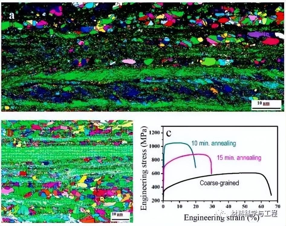 看来,我们对材料科学的传统理解往往不足以解释HS材料的机械行为,在我们设计具有优异性能的HS材料之前,还有许多科学问题需要解决。例如,异质结构钛通过冷变形加工,然后进行部分再结晶退火。冷变形产生了具有高强度但低延展性的纳米结构。退火降低了整体位错密度并产生了一些大的微米级晶粒,根据我们的传统教导,这两者都应该降低强度。然而,异质结构的钛在退火后仍保持高强度,与传统的材料科学背道而驰。
