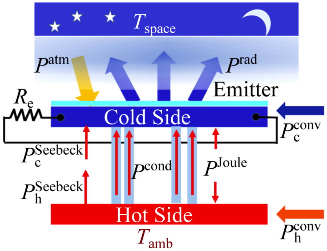 利用这样的原理,这套夜间发电系统的能量 “进口” 是来自于地球夜间的大气,比如夏天气温可以达到三十八九度,通过热端材料能够给这个系统输入能量,而冷端的输出就是如何把能量最高效地发射到外太空。