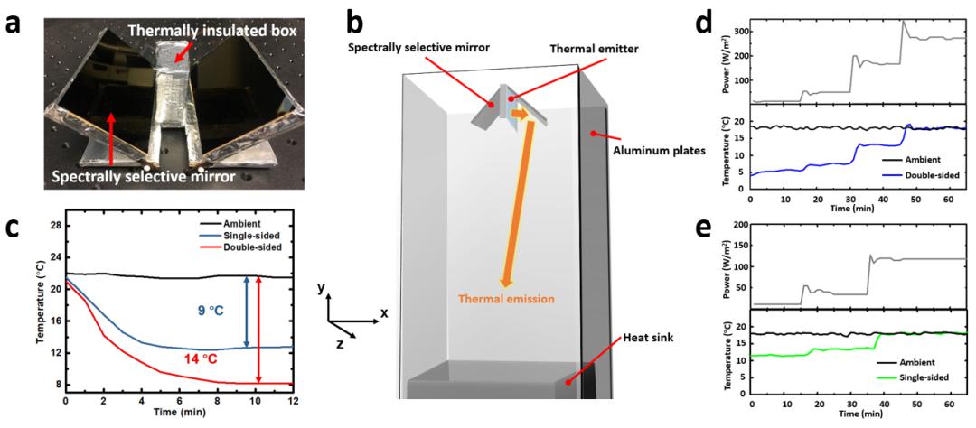 如图3所示,该团队利用选择吸收镜搭建了双面辐射制冷系统,并在室内的模拟环境下对比测试了该系统的制冷效果:在以液氮为冷源的室内模拟环境中,双面系统可实现14°C的降温以及270W/m2的制冷功率,在单面系统的基础上近乎提升了一倍。