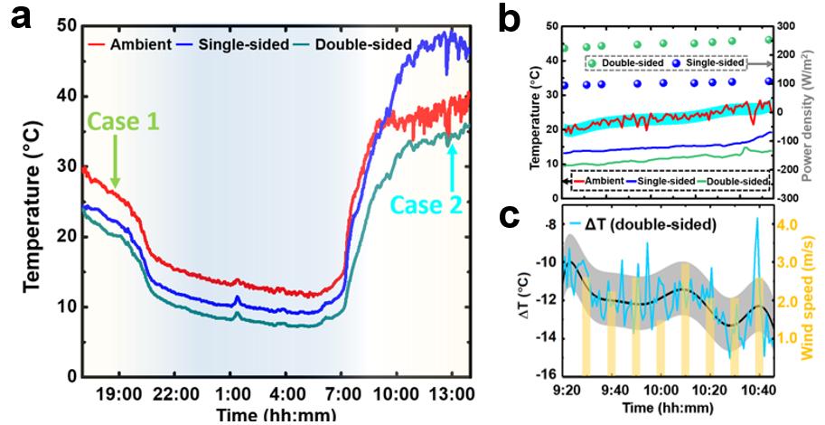 ▲图3. 双面辐射制冷系统以及其制冷效果测试结果。
