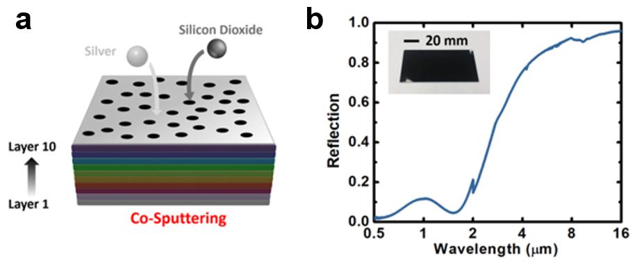 本文研究者通过实验提出了一种双面辐射制冷的系统。如图2所示,该团队通过共溅射银与二氧化硅颗粒的方式制备了多层薄膜。由于渐变的折射率特性,该薄膜材料在可见波段呈现强烈吸收,并在中红外波段表现出高反射,实现了选择性吸收的特性。
