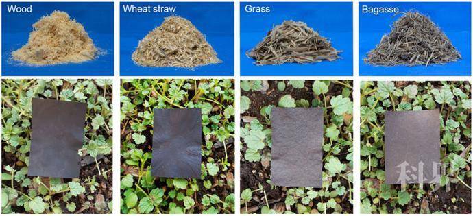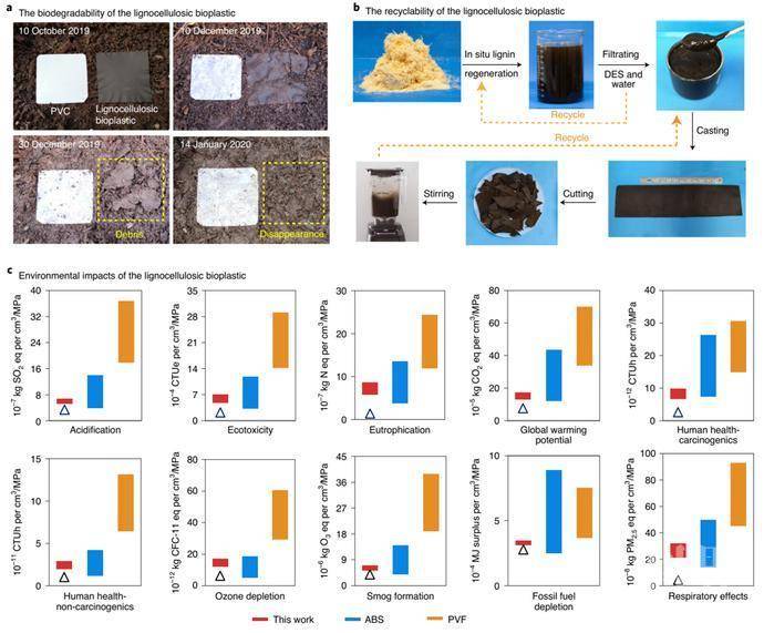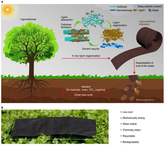 马里兰大学“木头大王”胡良兵教授联手耶鲁大学YaoYuan课题组提出了一种原位木质素再生法来合成木质纤维素生物塑料,只需要将木粉溶解-加水沉淀,然后简单浇铸就能制备出生物塑料。这种材料拉伸强度高达128 MPa,在水中浸泡30天也能完好如初,在土壤中3个月后就能完全降解,反复使用5次后性能也没有下降,草、麦秆和甘蔗渣都可以拿来加工,可以作为农业地膜、建筑材料和汽车部件使用。