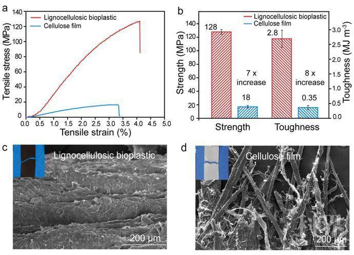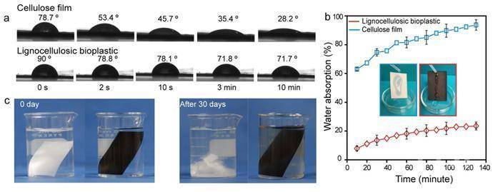 再生木质素含有极性亲水侧链和非极性疏水主链,极性侧链可以与微/纳米纤维素交联来提高材料的机械性能, 拉伸强度高达 128 MPa,而非极性主链可以降低吸水性:生物塑料的水接触角为90.0±8°,比纯纤维素膜的水接触角(78.7±10°)高;生物塑料的吸水率为30%,远低于纤维素膜的100%;在水中浸泡30天后,纤维素膜完全分解,而生物塑料形状没有任何改变。