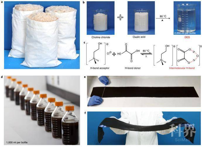 研究者以木材加工废弃物木粉为原料来制备生物塑料。他们首先找到了一种绿色环保的共溶剂(DES):氯化胆碱和草酸,通过破坏木粉纤维之间的氢键可以有效的溶解木质素,玻璃棒搅拌一下就形成了纤维素和半纤维素的混合溶液。然后向溶液中加水,由于木质素的疏水性,加水后溶解的木质素原位再生,再用水洗去残留的DES,就得到了高粘度纤维素-木质素浆料,固含量20 wt%。室温下把水分蒸发掉,简单的刮个膜,就得到了100×15×0.1 cm的生物塑料薄膜。