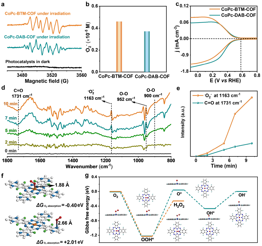 图4. (a) 在不同条件下测试的 EPR 光谱。(b) 在CoPc-BTM-COF和CoPc-DAB-COF光催化体系中,NBT法检测到的·O2-光催化产率。(c) 在 0.1 M 磷酸盐缓冲盐水中,CoPc-BTM-COF 和 CoPc-DAB-COF 在 1600 rmp 记录的极化曲线,并同时检测环形电极处的 H2O2。(d) CoPc-BTM-COF 光催化系统的原位 FT-IR 光谱与照射时间的关系,以及 (e) 1163 和 1731 cm-1 处的峰强度与照射时间的关系。(f) CoPc-BTM-COF 的 Co 原子和 N 原子上计算的氧吸附能(C:浅灰色;N:蓝色;F:绿色;Co:橙色;O:红色;H:白色)。(g) CoPc 上 2e–(橙色线)和 4e–(青色线)ORR 过程的自由能图,每个步骤的结构都经过优化。