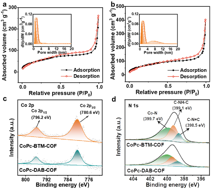 图2. (a) CoPc-BTM-COF 和 (b) CoPc-DAB-COF 的 N2吸附等温线。插图:CoPc-BTM-COF 和CoPc-DAB-COF 的孔径分布。CoPc-BTM-COF 和 CoPc-DAB-COF 的 (c) Co 2p 和 (d) N 1s 的高分辨率 XPS 光谱。